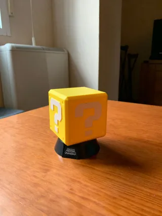 Lámpara con diseño del bloque de interrogación de Super Mario Bros. - Base negra. - Diseño icónico de Super Mario.