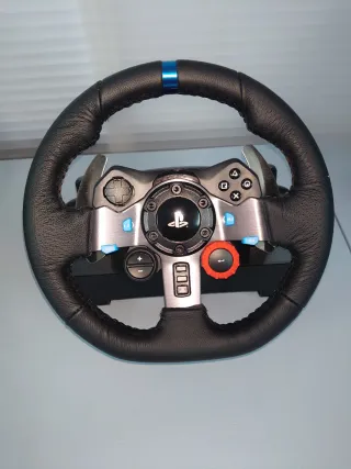 Volante de carreras Logitech para PlayStation con pedales. - Diseño ergonómico para un agarre cómodo. - Anillo azul decorativo en el volante. - Base con logo de Logitech G.