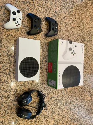 Consola Xbox Series S en color blanco, junto con tres controles (los negros los regalo) y unos auriculares MSI negros para poder hablar con amigos. La consola funciona y no tiene casi uso porque juego generalmente en pc. - Capacidad de 512 GB. - Mando original incluido - Auriculares msi - Muy silenciosa Se puede venir y probar, también puedo mandar video del funcionamiento o del poco ruido que hace.