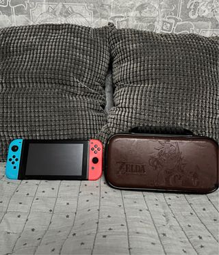 Consola Nintendo Switch con sus mandos Joy-Con en azul y rojo. Incluye una funda protectora con diseño de Zelda. - Mandos Joy-Con desmontables y originales - Pantalla táctil. - Funda de transporte con diseño de The Legend of Zelda. La funda está algo desgastada pero hace su función perfectamente. La pantalla tiene un pequeño pique pero solo se ve al fijarse mucho, en la última foto se aprecia