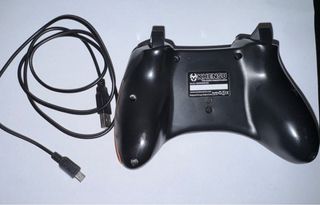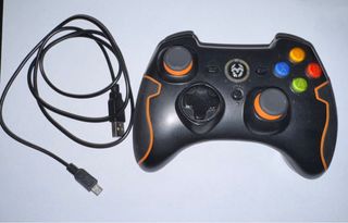 Mando de videojuegos en color negro, diseñado para una experiencia de juego inmersiva. Incluye un cable para conexión. - Diseño ergonómico. - Botones de colores (amarillo, azul, rojo, verde). - Sticks analógicos con detalles naranjas.