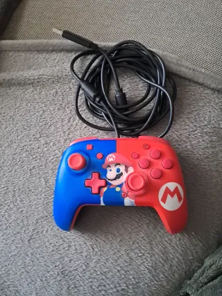 Mando de videojuegos con diseño de Mario Bros. - Diseño dividido en azul y rojo. - Imagen de Mario Bros en el centro. - Logo de Mario en el lateral derecho.