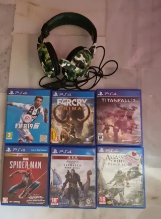 Se vende lote de 5 videojuegos para PS4 junto con unos cascos con diseño de camuflaje. - Juegos incluidos: FIFA 19, Far Cry Primal, Titanfall 2, Marvel's Spider-Man (Game of the Year Edition), Assassin's Creed Valhalla. - Cascos con diadema ajustable y almohadillas. - Diseño de camuflaje en los cascos.