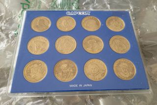 Vendo set completo de monedas/fichas de plata de Street Fighter II Arcade de 1992 para usar en algunas salas recreativas japonesas de la época. En el anverso se encuentran grabados los retratos de cada jugador con sus nombres japoneses y países de origen: Vega es el nombre original de M. Bison, Balrog es el contendiente enmascarado español (Vega) y M. Bison es "nuestro" Balrog, el boxeador. El reverso menciona específicamente la "Edición Campeón" del juego. Las monedas se incluyen en un álbum con un parche bordado como regalo. Estos álbumes fueron distribuidos como promoción por la revista norteamericana Nintendo.