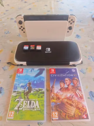 Consola Nintendo Switch con accesorios y dos juegos. - Incluye funda de transporte. - Juegos: The Legend of Zelda: Breath of the Wild y Civilization VI, super Smash bros ultimate, Splatoon 2 y Nintendo switch sports.