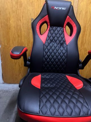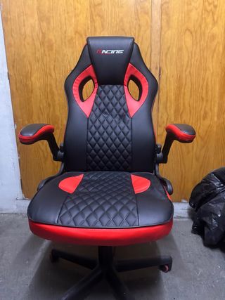 Silla de estilo gamer en color negro con detalles en rojo. Su diseño ergonómico ofrece comodidad. - Tapicería acolchada con costuras en rombos. - Reposabrazos acolchados. - Base con ruedas para fácil movilidad. TENGO 1 SILLA IGUAL Y VENDO LAS DOS POR 100€ !!
