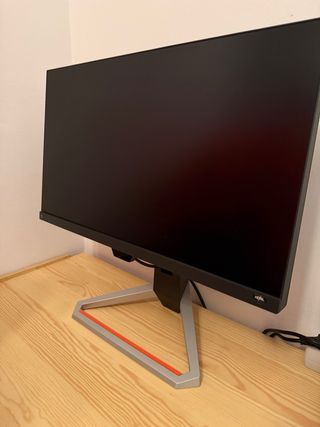 Monitor BenQ con un diseño moderno y elegante, ideal para gaming. (NO HAGO ENVIOS, NO REGATEOS) - Base triangular plateada con detalles naranjas. - Pantalla de gran tamaño. - Marco negro.