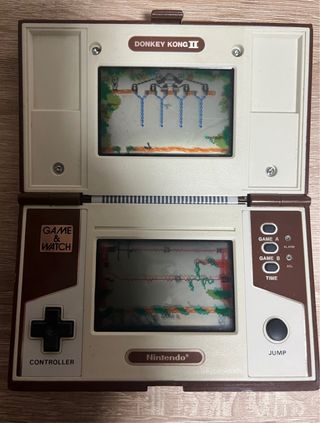 Consola portátil clásica de Nintendo. - Diseño de pantalla dual. - Carcasa plateada y marrón. Funciona adecuadamente. Solo le falta la tapa de las pilas.