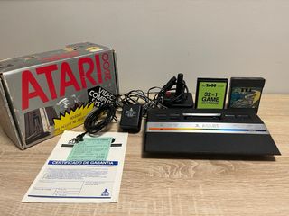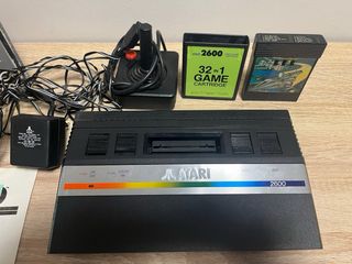 Consola Atari 2600 Video Computer System, ideal para coleccionistas y amantes de los videojuegos retro. - Incluye consola, joystick, fuente de alimentación y dos cartuchos de juegos. - Un cartucho es de 32 in 1 GAME CARTRIDGE y el otro 9 en 1 con una imagen de un juego de naves. Funciona adecuadamente. La fuente de alimentación tiene una pequeña rotura en el cableado.