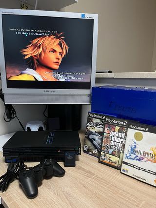 Consola PlayStation 2 modelo SCPH-50004 en color negro. Incluye mando, tarjeta de memoria y los siguientes juegos: - Need for Speed: Most Wanted - Grand Theft Auto: San Andreas - Final Fantasy X Incluye modulo para jugar a juegos a trabes de HDD (se incluyen ambos). El mando tiene una pequeña rotura en el cable, pero funciona bien.