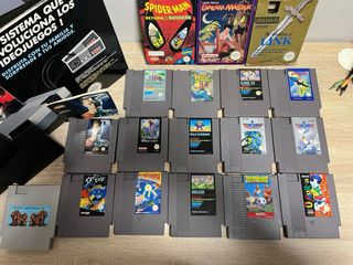 Consola clásica Nintendo Entertainment System (NES) en color negro y gris. Incluye la caja original. - Incluye la consola. - Incluye la caja original. - Incluye 18 juegos (2 completos y 1 semicompleto; ver fotos).