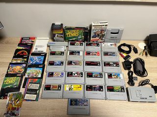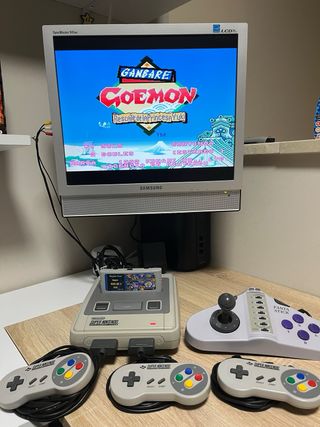 Consola Super Nintendo con 19 juegos y cartucho everdrive. Incluye 3 mandos originales y un joystick. - Incluye juegos como Super Mario All-Stars, Super Tennis, The Legend of Zelda y más. - Adaptador Universal. - Tribal Tap. - Instrucciones de varios juegos. Las dos almohadillas de la consola están derretidas y pegajosas, pero se pueden sustituir por unas nuevas.