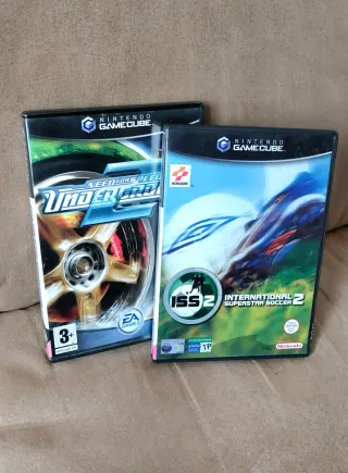 Pack de dos juegos para Nintendo GameCube. - Need For Speed: Underground. - ISS 2: International Superstar Soccer 2. - Discos casi impolutos. - Completos con manual de instrucciones. - Pal 🇪🇦. - Carátulas con signos de uso/desgaste. #gamecube #clásicos #carreras #fifa #pes #gc #retro #colecconismo #supermario #zelda #metroid #gta