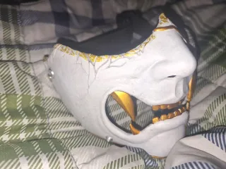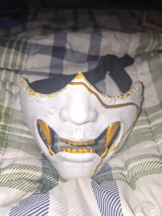 Máscara inspirada en el estilo Oni, similar a las vistas en el juego Ghost of Tsushima. Detalle de pintura dorada y acabado blanco agrietado. - Diseño de máscara Oni. - Detalles en dorado. - Acabado blanco con efecto agrietado.