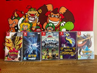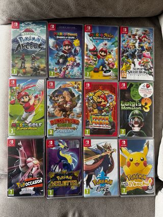 Doce videojuegos para Nintendo Switch. - Pokémon Espada - Pokémon: ¡Vamos, Pikachu! - Pokémon: Perla Reluciente Pokemon violeta Pokemon arceus Luigis mansion 3 Paper mario Donkey kong Mario golf Super smash Mario rabbids kingdom Mario rabbids sparks