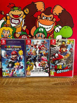 Tres videojuegos para Nintendo Switch. - Mario + Rabbids Sparks of Hope (Cosmic Edition) - Super Smash Bros. Ultimate - Super Mario Odyssey en perfectas condiciones SOMOS POWER VIDEOGAMES 🎮👾🕹️ TENEMOS LAS MEJORES CONSOLAS DEL MERCADO, Garantizadas. FOTOS REALES LO QUE VES ES LO QUE COMPRAS.! Tienda especializada en NINTENDO SWITCH TODOS NUESTROS ARTÍCULOS ESTÁN CUIDADOSAMENTE PROBADOS POR EXPERTOS. SOMOS LOS MEJORES DE ESPAÑA 🇪🇸 Y EUROPA EN CALIDAD PRECIO.