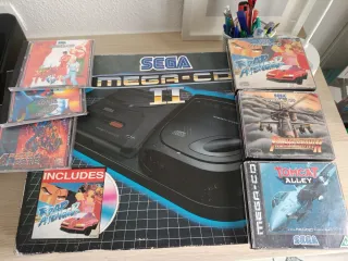 Consola Sega Mega CD 2 en color negro, con varios juegos.Los tres originales están completos, los otros son repros ,funcionan bien al igual que la consola. - Road Avenger - Sonic CD - Robo Aleste - Thunder Force II - Tomcat Alley - final fight