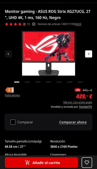 Monitor gaming ASUS ROG Strix XG27UCG de 27 pulgadas. - Resolución UHD 4K. - Tiempo de respuesta de 1 ms. - Tasa de refresco de 160 Hz. - Color Negro. se vende por qué me regalaron uno oled