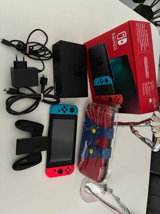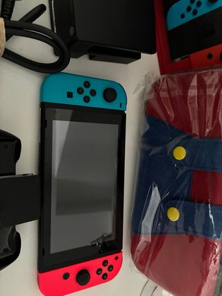 Consola Nintendo Switch con sus accesorios. Funda de regalo nueva estilo super Mario Apenas ni 30 horas de uso Sin SD - Incluye base de carga. - Mandos Joy-Con en azul y rojo. - Adaptador de corriente.