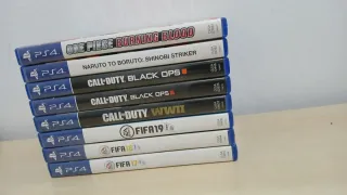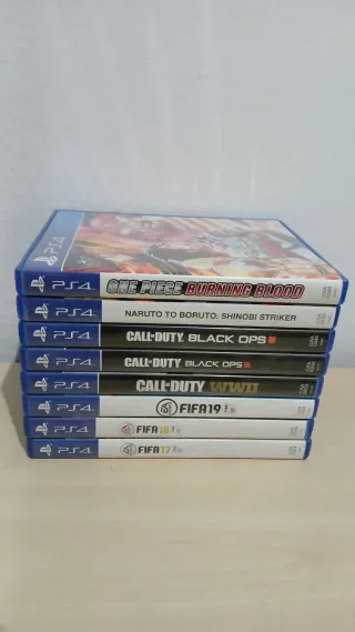 Todo el pack de 8 videojuegos para PlayStation 4. - One Piece: Burning Blood - Naruto to Boruto: Shinobi Striker - Call of Duty: Black Ops 4 - Call of Duty: Black Ops III - Call of Duty: WWII - FIFA 19 - FIFA 18 - FIFA 17