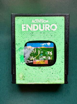 Enduro para Atari 2600. Cartucho 100% funcional, estado de las etiquetas según las fotos. Programado en 1983 por Larry Miller para Activision, este cartucho es considerado una maravilla técnica que llevó al límite las capacidades de la consola. Participa en la legendaria carrera de resistencia "National Enduro", donde el objetivo es rebasar a cientos de coches rivales a velocidades de vértigo. Famoso por su innovador ciclo de día y noche y sus cambios climáticos (niebla y nieve) que afectan la conducción, es un título de carreras imprescindible y una prueba de la calidad superior de Activision. Retro Gaming, Coleccionismo, vintage