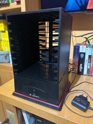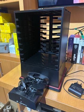 Torre de almacenamiento para videojuegos de la marca 4gamers. Diseñada para organizar y exhibir tu colección. - Color negro. - Base con detalles en rojo. - Diseño vertical para optimizar espacio. - Base extraíble para colocar y cargar dos mandos. INPORTANTE: La función de carga de mandos no funciona bien, ya que empiezan a cargar y enseguida detecta como que están cargados.