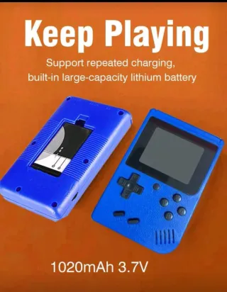 Consola de videojuegos portátil de color azul, con un diseño retro. - Pantalla LCD. - Botones de control. - Diseño compacto.