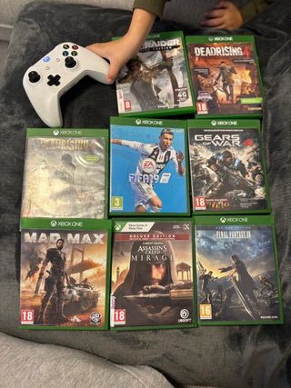 Colección de ocho videojuegos para Xbox One. - Tomb Raider - Dead Rising 4 - Dead Rising 2 - FIFA 19 - Gears of War 4 - Mad Max - Assassin's Creed Mirage (Deluxe Edition) - Final Fantasy XV (Day One Edition)