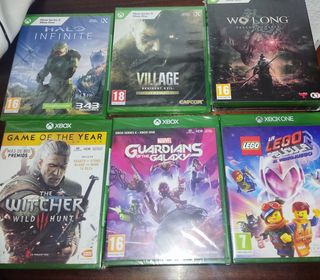 Lote de seis videojuegos para Xbox, todos precintados de fábrica. - Halo Infinite - Resident Evil Village - Wo Long: Fallen Dynasty - The Witcher 3: Wild Hunt (Game of the Year Edition) - Marvel's Guardians of the Galaxy - The LEGO Movie Videogame