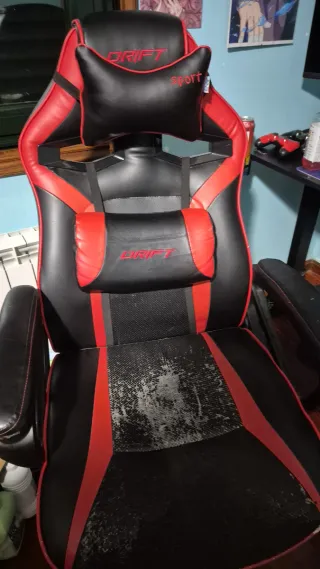 Silla gamer de la marca Drift, con un diseño deportivo en negro y rojo. - Tapicería en polipiel. - Cojines lumbar y cervical incluidos. - Base de 5 radios. Con una funda o un tapizado quedaría nueva, la cambio porque me regalaron una.