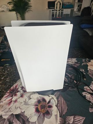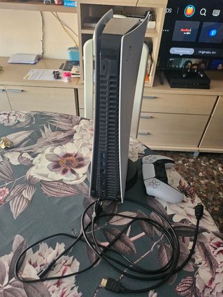 Consola de videojuegos PlayStation 5 en color blanco. - Diseño elegante y moderno. - Incluye base para colocarla en vertical. 1 mando y sus cables originales muy poco uso