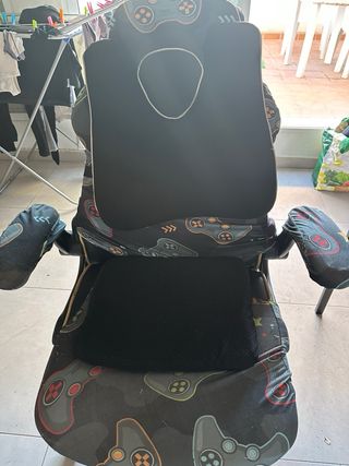 Silla gamer con un divertido diseño de mandos de videojuegos en tonos grises y de colores. - Funda para reposabrazos con estampado. - Cojín lumbar incluido. - Diseño de mandos de videojuegos. está un poco picada por las gatas , pero lo doy con las fundas incluido .