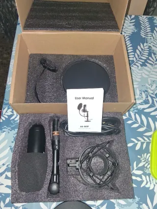 Manual de usuario para el kit de micrófono de podcasting AU-A03T. Incluye instrucciones para su configuración y uso. - Guía de inicio rápido. - Diagrama de componentes. - Consejos de optimización de audio.