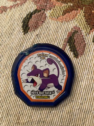 Tazo coleccionable de Pokémon de la serie Nox. - Ilustración de Rattata, número #019. - Diseño con borde naranja y azul. - Copyright ©2005 Pokémon/Nintendo.