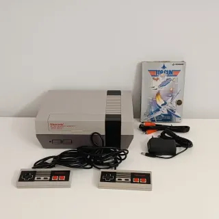 Consola Nintendo Entertainment System (NES) original en color beige. En muy buen estado. Funciona todo perfectamente. Incluye la consola, dos mandos, fuente de alimentación, cable AV y el juego Top Gun completo. - Consola NES original. - Dos mandos originales. - Fuente de alimentación. - Cable AV. - Juego Top Gun con caja bastante deteriorada, cajetín negro e instrucciones. Se envía por wallapop.