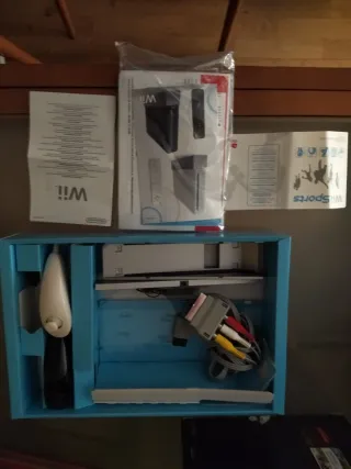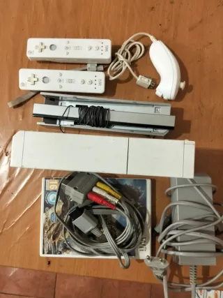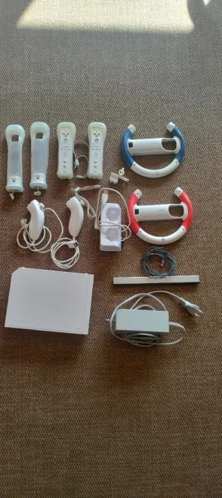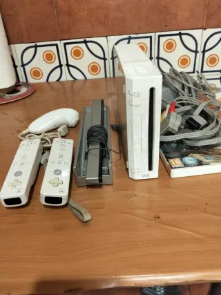 Consola Nintendo Wii en color blanco, lista para jugar. Incluye todos los cables necesarios para su conexión y funcionamiento. Tiene varios mandos y se incluye todo lo que se ve en la foto.