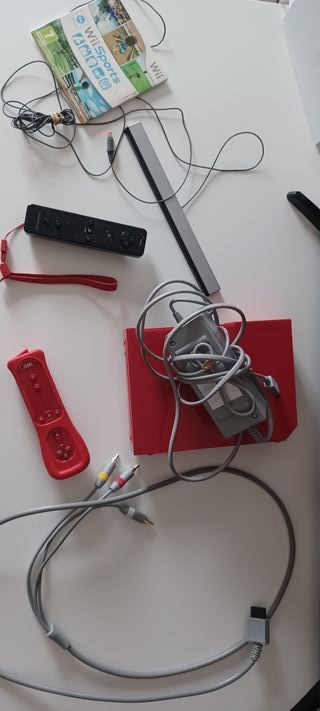 Consola Nintendo Wii en color rojo, junto con 2 mandos (rojo y negro) y juego (wii sports). Sin signos de uso, mandos totalmente funcionales, funciona todo perfectamente, está cómo nueva. SE DA OPCIÓN A COMPRAR JUEGO SOLO, POR CHAT. - Incluye consola Wii. - Mando Wii Remote en color rojo. - Mando Wii Remote en color negro. - Juego Wii Sports.