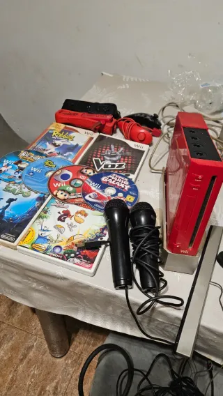 Vendo una consola Nintendo Wii blanca en buen estado, junto con seis juegos: Resident Evil: The Darkside Chronicles, Guitar Hero: Warriors of Rock, Mario Kart Wii, Red Steel 2, y dos juegos de Mario Party 9. La consola se ve limpia y en excelentes condiciones. - Incluye 6 juegos. - Consola en buen estado.