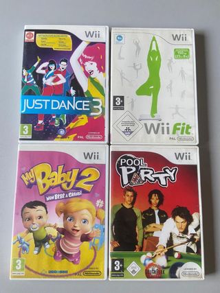 Vendo cuatro juegos para Wii en buen estado. - Incluye Just Dance 3, Wii Fit, My Baby 2 y Pool Party. - Las cajas se encuentran en condiciones aceptables.