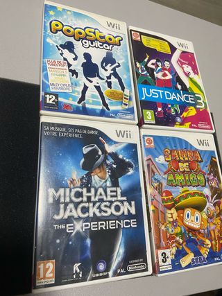 Juegos Wii en perfecto estado. - Incluye cuatro juegos: Just Dance 3, Michael Jackson The Experience, Popstar Guitar y Samba De Amigo. - Ideales para amantes de la música y el baile. - Listos para disfrutar de horas de diversión.