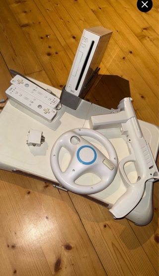 Consola Nintendo Wii en buen estado, lista para horas de diversión. Incluye accesorios como dos mandos, 6 juegos y tabla wii fit plus. - Consola Wii - Dos mandos Wii - Tabla Wii Fit Plus - Juego: Harry Potter - Juego: Donkey Kong Country Returns - Juego: Mario Party - Juego: Wii Sports - Juego: Guitar Hero - Juego: Super Mario Bros. Wii
