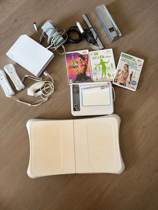 Consola Nintendo Wii con accesorios y juego Wii Fit Plus. - Incluye consola Wii con soporte. - 3 Mandos Wii. - 2 mandosNunchuk. - 3 fundas para mandos. - Sensor Bar. - Camara. - Cableado y adaptadores. - 1 micrófono. - tabla Wii Fit Plus. - Brazalete Zumba Fitness. Recogida en mano.