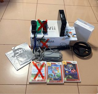 Consola Nintendo Wii completa con accesorios y juegos. Funcionando, con adaptador a HDMI para nuevas TV 5 mandos uno de ellos sin tapa, 4 nunchuks, va completa con sensor, alimentador un adaptador de volante bolsa para guardar nueva board con silicona y bolsa pero falta tapa de pilas 13 juegos (hay dos Mario kart pero uno de ellos está rallado y da problemas) todos funcionan sin problema funciona perfectamente