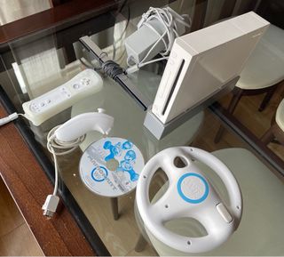 Consola Nintendo Wii en su embalaje original, con el juego Mario Kart. - Incluye todos los accesorios originales. - Volante para Wii. - Juego Mario Kart Wii.
