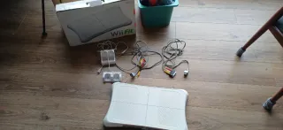 Leer Bien.Se vende tabla Wii Fit junto con sus cables y cargador de baterías. - La tabla Wii Fit tuvo pilas dentro mucho tiempo y se ha sulfatado. El boton power enciende pero no sincroniza. O al menoa no se como va.. - Cables de conexión. - Cargador para baterías. - juegos: samba de amigo, mario kart, mario party y fitness coach
