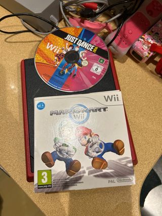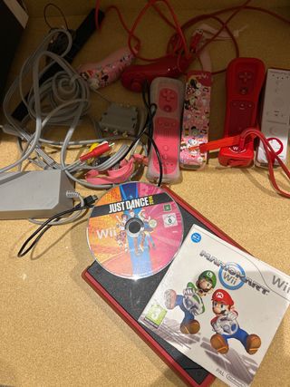 Consola Nintendo Wii Mini en color rojo, ideal para horas de diversión. - Incluye los juegos Just Dance 2014 y Mario Kart Wii. - Múltiples mandos y accesorios para jugar. - Cables de conexión y alimentación.