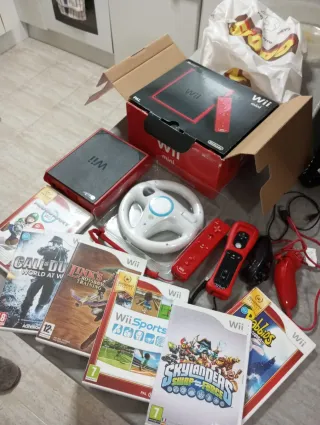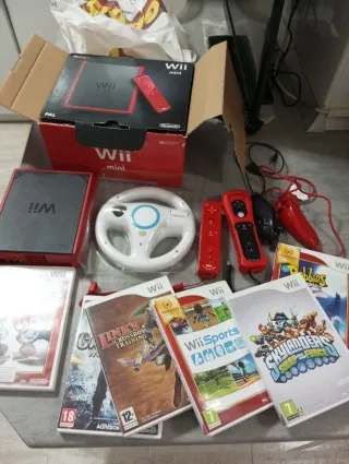 Consola Nintendo Wii Mini en color rojo, ideal para horas de diversión. - Incluye la consola Wii Mini. - Volante para juegos. - Dos mandos Wii Remote y Nunchuk. - Juegos: Call of Duty, Link's Crossbow Training, Wii Sports, Skylanders Swap Force, Rabbids. - Cables y accesorios necesarios.