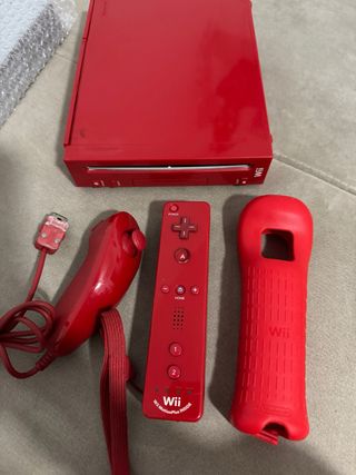 Se vende consola Wii en color rojo, junto con dos mandos en color negro y varios accesorios. - Incluye consola Wii. - Dos mandos de control. - Base de carga para mandos. - Fundas protectoras para mandos. - Cableado y adaptadores. - Un juego de Super Mario Galaxy.