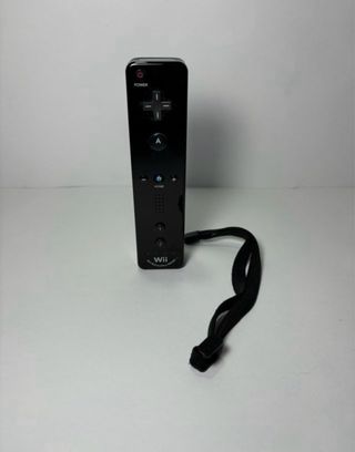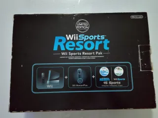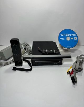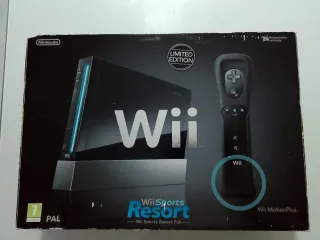 Consola Nintendo Wii en color negro, con todos sus accesorios originales y el juego Wii Sports Resort. - Incluye volante para juegos de carreras. - Dos mandos Wii Remote y 2 Nunchuk. Uno de los mandos lleva Wii MotionPlus incorporado. - Base para la consola. - Cableado y sensor de movimiento.