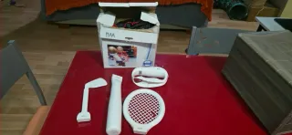 Conjunto de accesorios para Wii Sports. - Accesorio tipo palo de golf. - Accesorio tipo raqueta de tenis. - Accesorio tipo mando. - Accesorio tipo bate de béisbol. -Guantes de boxeo,la caja esta rota,pero los guantes estan bien,el conjunto por 30€,los guantes solo 20€
